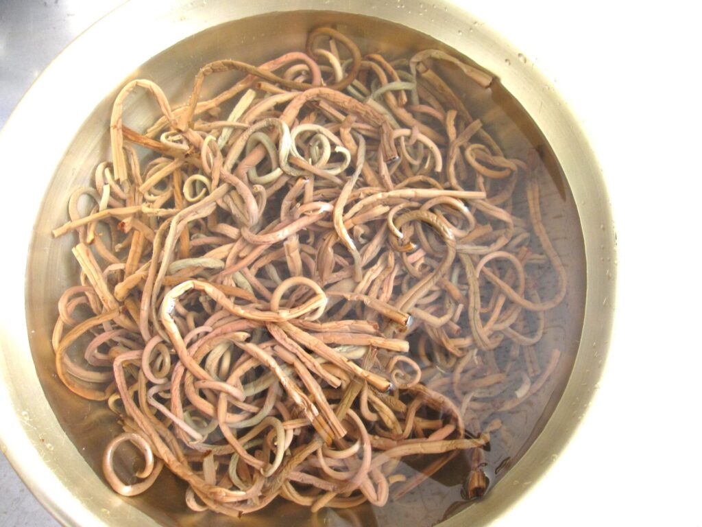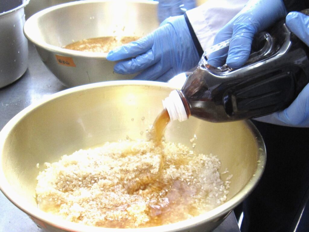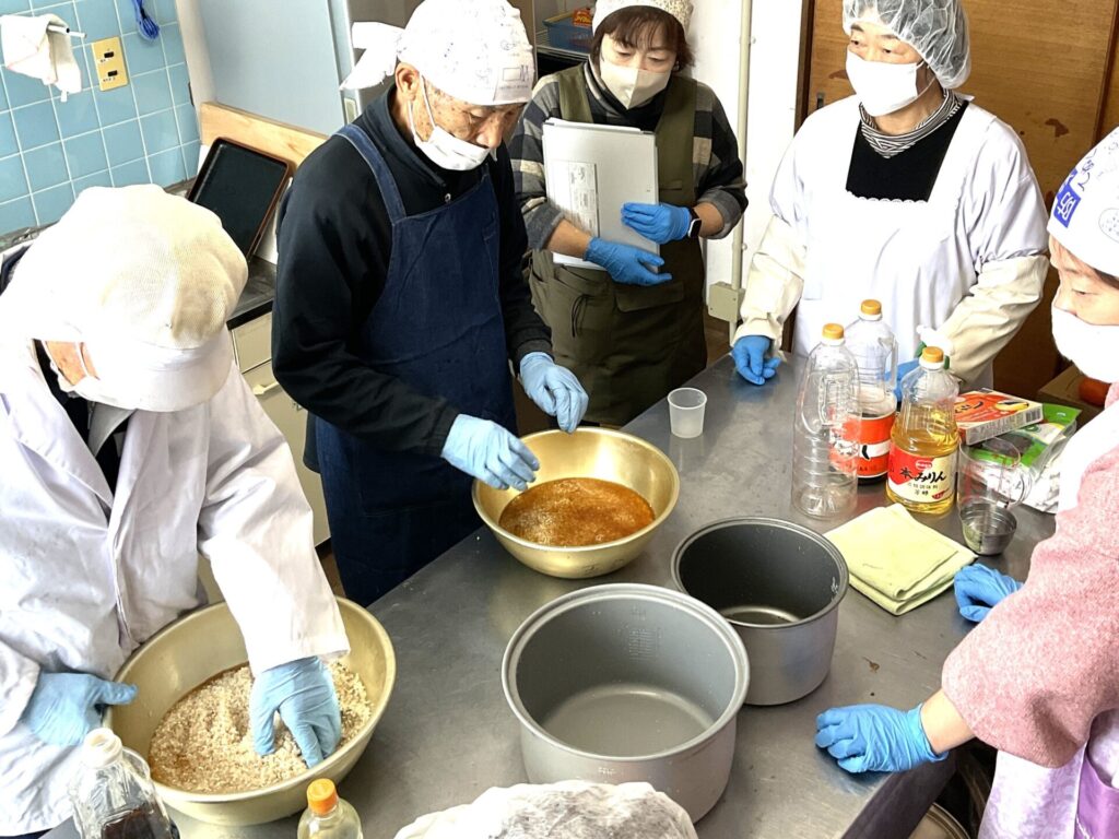 12月5日(金)お父さんの料理教室を行いました。今回は玉響の会の皆さんに山菜料理を教えて頂きました。料理の前に、まずはりっぱな山菜にびっくりしました。前日下処理をして頂いておりましたので、当日は米を洗ってシソを煮出したタレで色(風味)を付けるところから。