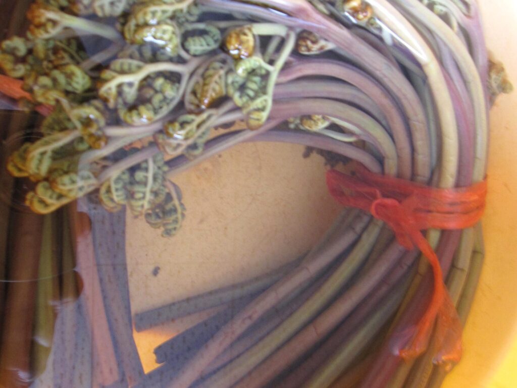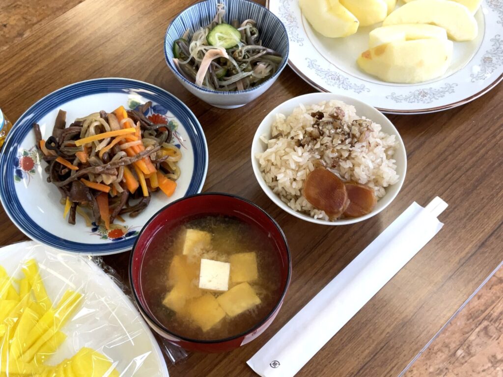 ファジー機能(死語?)付き炊飯器でご飯を炊いている間に、ぜんまい、油揚げ、人参、シイタケ、糸コンを切って、味付けして鍋で煮て。サラダ用のワラビ切ってハム、キュウリ、春雨を切ってドレッシングで和えました。味噌汁も作りました。豆腐を切ってワカメを入れて、今年の3月に皆で作った味噌(四方山味噌)を入れました。ご飯が炊け炊飯器の蓋を開けたら、シソの香りの美味しそうなご飯の出来上がり。茶碗に山盛り。