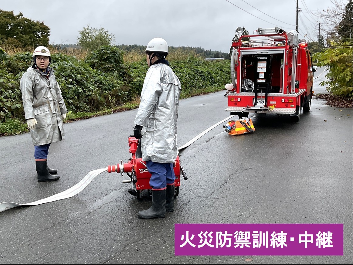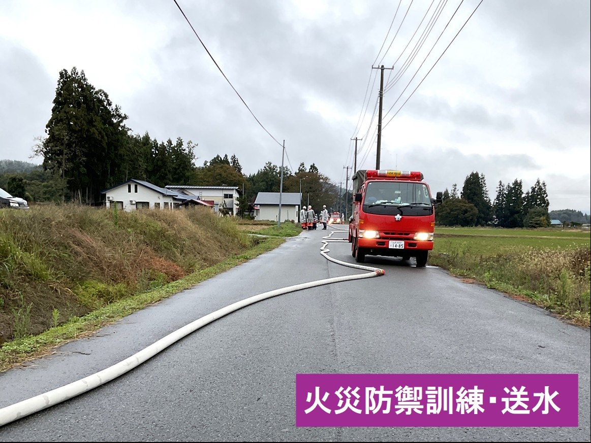 10月26日(日)消防団第五分団、第六分団合同の令和7年度秋季消防演習が行われました。今回は東沢地区を会場として火災防禦(ぼうぎょ)訓練、式典を行いました。火災防禦(ぼうぎょ)訓練は午前9時、奥田上公民館から出火、東からの風にあおられ建物全体、及び周辺林に延焼拡大が懸念される、と言う想定で実施されました。雷堤から積載車、可搬ポンプ合計6台で約400mのホース延長による消火訓練を行いました。