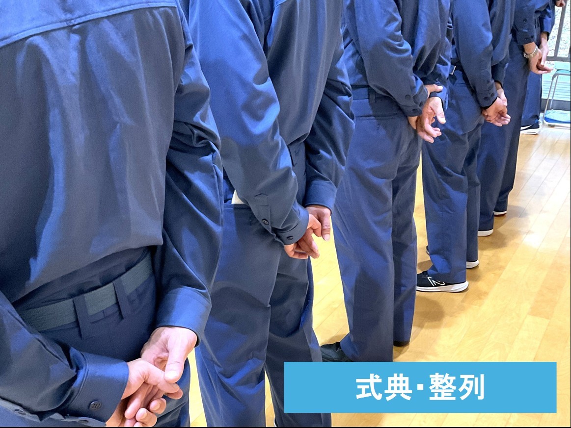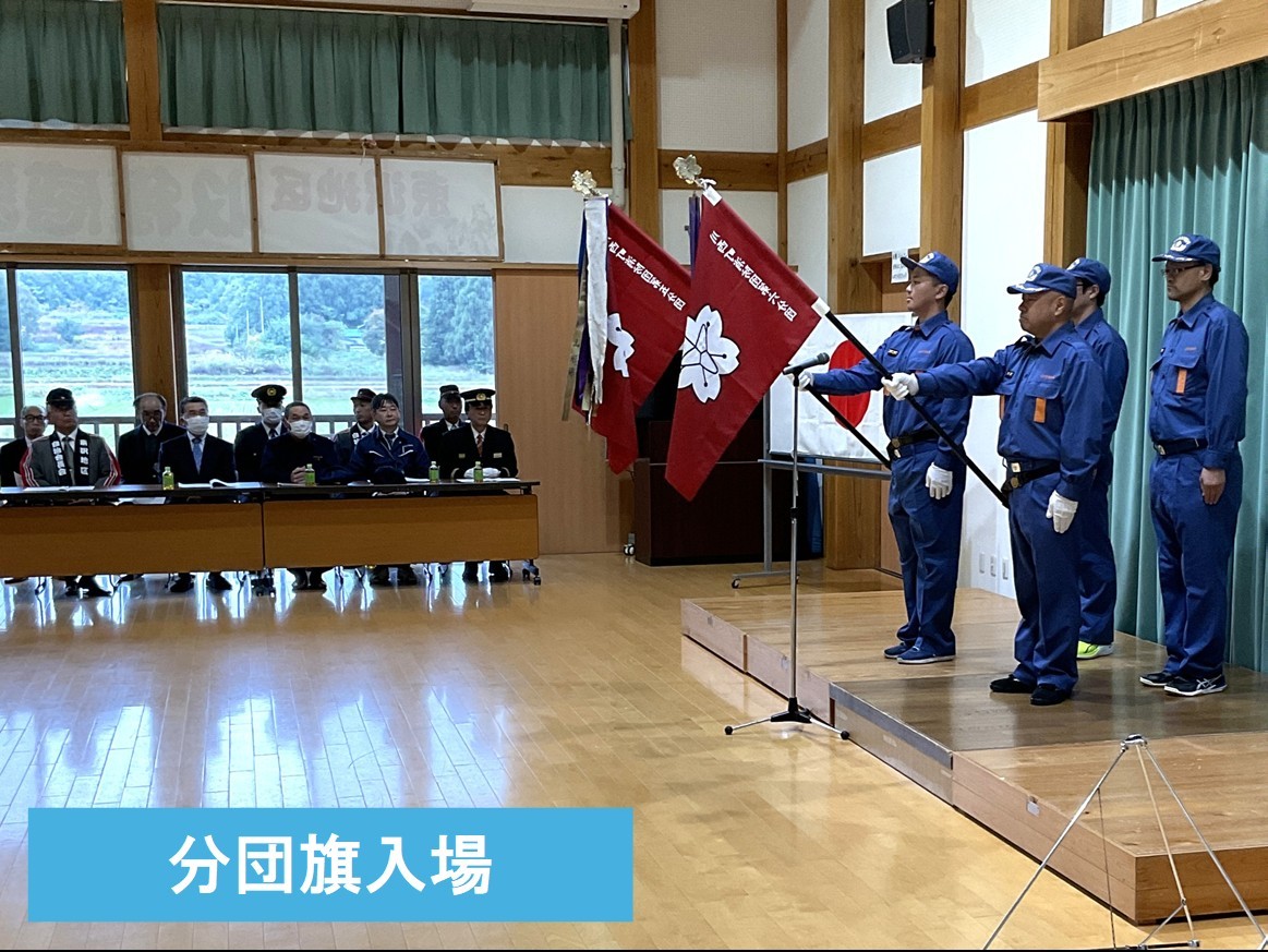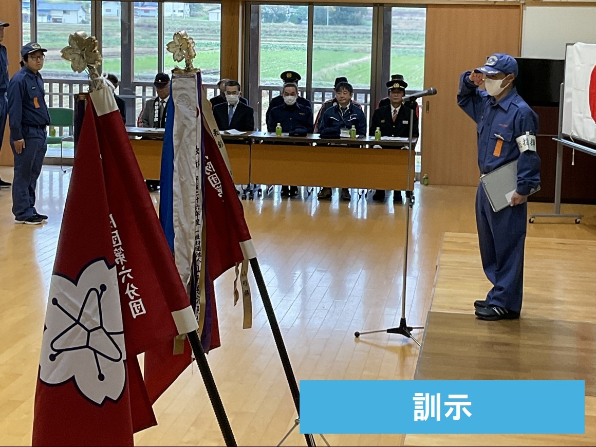 式典は雨のため東沢交流センターホールにて実施しました。集合、人員報告、分団旗入場、人員姿勢服装の点検を行いました。総指揮者(第五分団分団長)からの訓示の後、町長表彰、団長表彰を行い、ご来賓の方にご挨拶を頂き日程を終了しました。