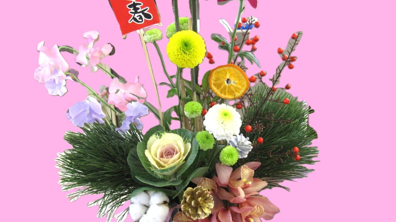 松、南天、ヒムロヒバ、しの竹、デスパットマム(一輪咲きの洋菊の一種)、スイートピー、シンビジューム、松かさ、ドライオレンジを使ってのアレンジ。きれいなお花で新しい年を迎えることは気持ちいいことですね!